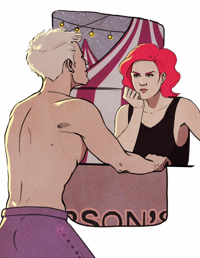 Summary: Circus era Clintasha. Clint really wants to impress her, Nat is just trying not to laugh at his sparkly pants. Clint’s pose was inspired by a Zdenka Braunerová study.